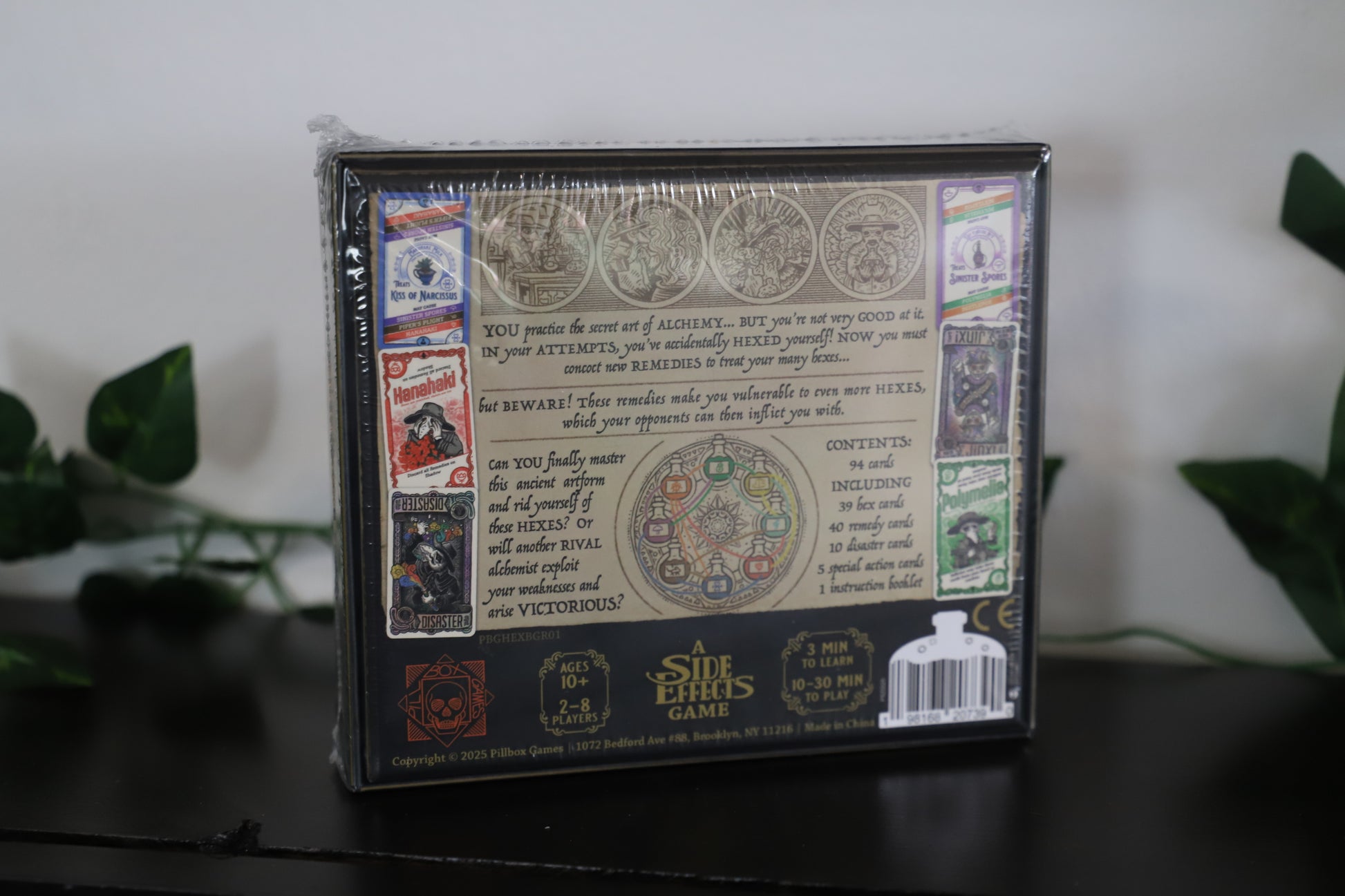 Hex Effects is a "take that" style card game featuring Hexes (that you need to rid of) and Remedies (that treat Hexes but may cause you to have more). It is an easy-to-pickup game with original artwork by Pillbox Games. It's based on the game Side Effects.