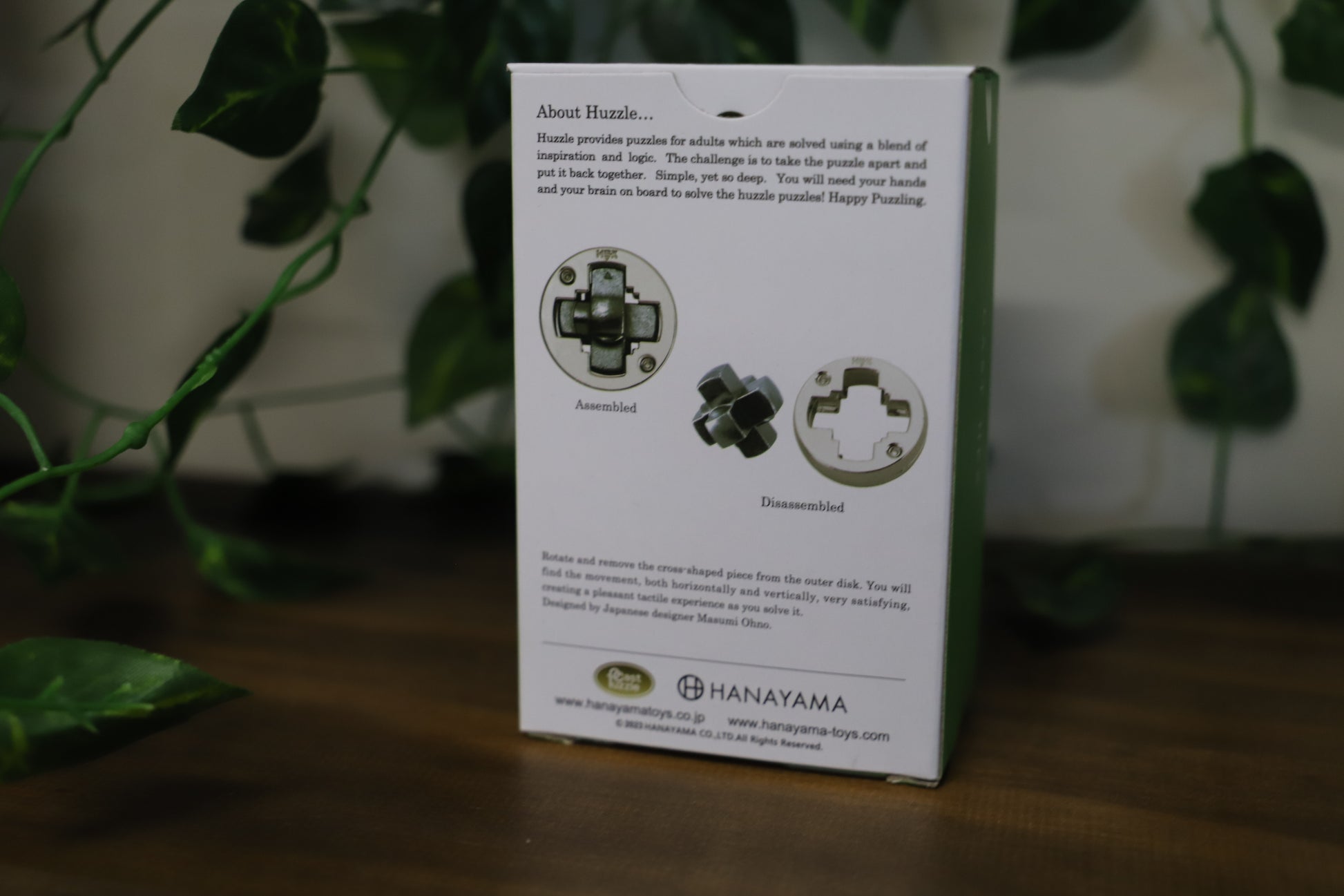 Rotate and remove the cross-shaped piece from the outer disk. You will find the movement, both horizontally and vertically, very satisfying, creating a pleasant tactile experience, as you solve it. Designed by Japanese Designer Masumi Ohno.