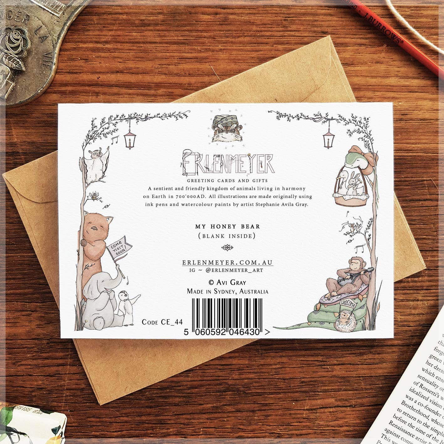 A honey bear knows what a honey bear loves. This makes a sweet Valentine's card or anniversary card. The Original Ink and Watercolour Illustration was created by Avi Gray © This A6 greeting card has been professionally printed on 300gsm Felt paper. It Includes a brown paper envelope and is wrapped in a plastic sleeve. The card is folded and blank inside - 14.85cm x 10.5cm