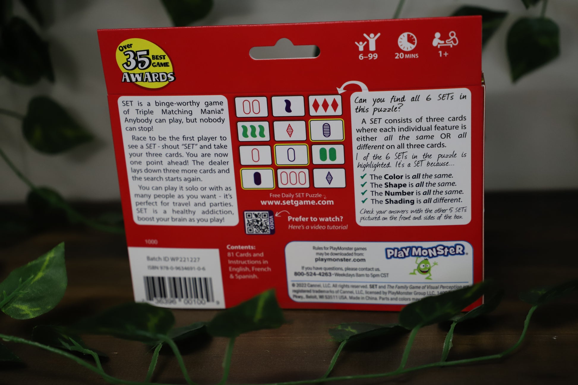 To play, one person takes the deck and lays out twelve cards face up. The first person to spot a set collects those three cards; if the player was mistaken, then this player cannot claim a set until after another player has done so. After someone has claimed a set, the cardholder lays out three more cards. (If all players agree that no sets can be claimed, then the cardholder lays out three more cards. These cards aren't replaced after someone claims a set.) Whoever claims the most sets wins!